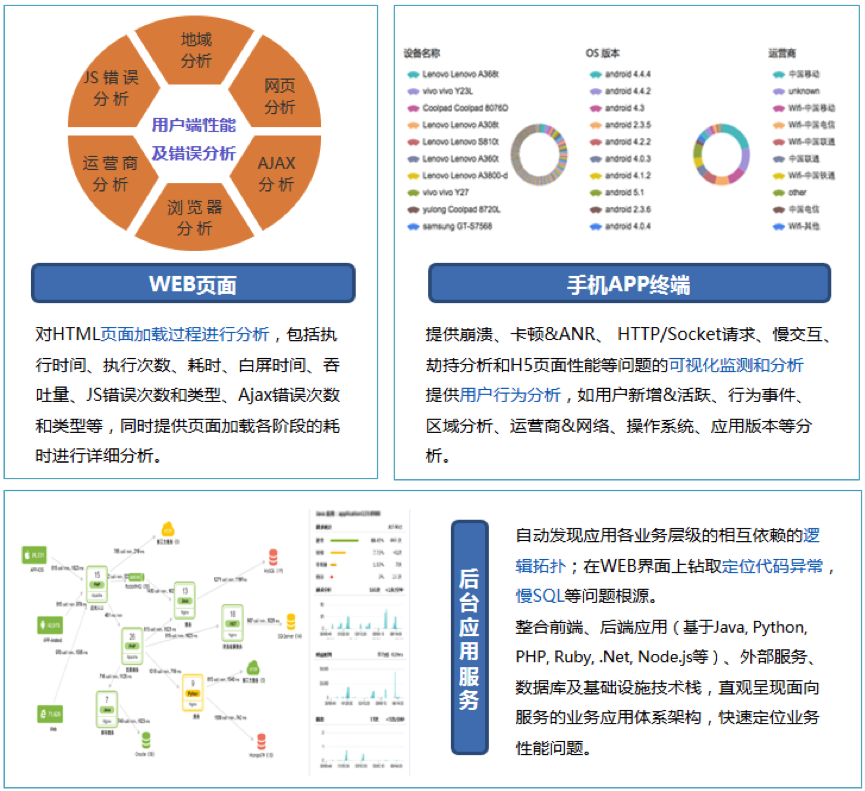 应用质量管控,腾博会官网应用质量管控系统给予对应用全生命周期和全事务过程的质量托管。从用户终端、后台服务到IT设备层的端到端全程监控;应用性能劣化预警;应用性能分析与根原因定位;用户体验分析和问题过程回放;用户活性分析、转化率分析;
